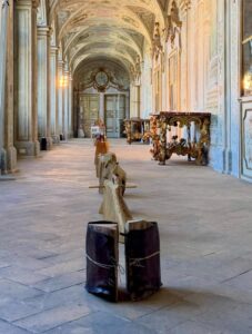 Al Piano Nobile è allestita “Agraria”, mostra personale di Franco Troiani a cura di Saverio Verini, progetto che coincide con gli ottant’anni dell’artista e con la ricorrenza dei quarant’anni dello STUDIO A’87 da lui fondato, realtà che ha svolto un ruolo fondamentale per la scena artistica di Spoleto e dell’Umbria. La mostra mette in dialogo la materialità essenziale dei lavori – realizzati prevalentemente in legno ed elementi trovati – con la fastosità degli arredi storici, attivando una relazione dialettica tra le opere e gli ambienti del Piano Nobile.