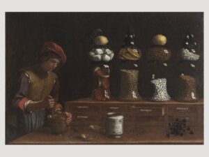 Le tableau a été peint en 1637 par Paolo Antonio Barbieri, le frère du Guerchin, qui est mentionné dans les sources comme un « peintre qui excelle à représenter les poissons, oiseaux, fleurs et fruits ». D’après son livre de comptes, il apparaît que le commanditaire de l’œuvre fût le spolétain Alfonso Palettoni, gouverneur de Cento, terre-patrie des deux peintres – dont un portrait, également attribué à leur atelier, est conservé au Palazzo Collicola. La scène représente un commis occupé à broyer ses épices dans un mortier. Comme l’indiquent les étiquettes, les tiroirs du bahut contiennent de la cannelle, du sucre et des clous de girofle. Au-dessus, sont disposés des bocaux en verre à l’intérieur desquels on peut reconnaître des haricots et graines, des noisettes, mais aussi des biscuits et des coings, dessert très prisé à l’époque.