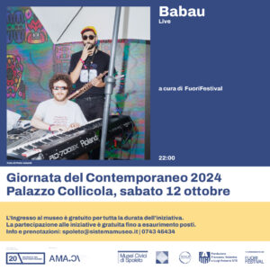 La Giornata del Contemporaneo vedrà ancora il coinvolgimento dell’associazione FuoriFestival, che alle ore 22.00, nel loggiato esterno al piano terra di Palazzo Collicola, curerà una performance live di Babau, duo formato da Matteo Pennesi e Luigi Monteanni, con all’attivo numerose partecipazioni a festival musicali nazionali e internazionali (Fusion, Club to Club, Terraforma, Nextones…). Le proposte a cura di FuoriFestival nascono da una collaborazione con l’associazione Amici di Palazzo Collicola e rientrano nell’ambito delle attività organizzate grazie al sostegno della Fondazione Francesca, Valentina e Luigi Antonini.