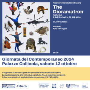 Si parte alle ore 19.00 con la presentazione dell’installazione inedita The Dioramatron featuring A Self-Portrait in 50 Still-Lifes di Jeffrey Isaac, che vede la collaborazione di Nyla van Ingen per la parte sonora. L’opera, allestita nella sala di fronte alla Biblioteca Carandente, è un enorme “carillon pittorico”, con le figure dipinte da Isaac che si succedono una dopo l’altra; grazie a un sofisticato meccanismo messo a punto dall’artista stesso, il pubblico può attivare l’opera e osservare la tela dipinta scorrere senza soluzione di continuità – allo stesso modo delle immagini sui nostri telefoni –, offrendo un’immersione nel caleidoscopico immaginario di Isaac. Il Dioramatron sarà visibile liberamente per tutta la serata.