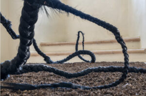 La pratica del lavoro in situ è un’altra delle opzioni rappresentate in mostra, che congiunge la scultura a un determinato contesto: significativa in questo caso la grande carta di Jacopo Martinotti, che riporta un frottage dei mosaici della Casa Romana (I sec. d.C.), conferendo consistenza plastica al disegno. Allo stesso modo, Bekhbaatar Enkhtur lavora sul posto con un materiale organico come la cera d’api per costruire l’immagine deperibile di una tigre, attingendo al simbolismo della cultura di origine mongola. Il suo caso di artista internazionale formatosi in Italia segnala un altro dei dati più interessanti dell’esposizione: l’emergenza di soggettività inedite nel panorama nazionale, che contribuiscono alla riscrittura del canone plastico. Fra queste anche Binta Diaw, italiana di seconda generazione che tematizza la propria identità attraverso il ricorso ai capelli come materiale d’elezione, qui composti in un’installazione che richiama l’immagine anfibia della mangrovia come metafora dei processi di radicamento migratorio.