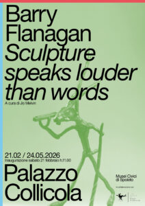 Al secondo piano di Palazzo Collicola sarà allestita la mostra Sculpture speaks louder than words di Barry Flanagan, a cura di Jo Melvin, prima esposizione personale dell’artista in Italia dopo la sua scomparsa nel 2009. Il progetto, realizzato grazie al sostegno e alla collaborazione con The Estate of Barry Flanagan and Plubronze, propone una selezione di opere che raccontano la ricerca dell’artista britannico, dai primi esperimenti con materiali eterogenei – sabbia, corde, tessuti, gesso, argilla e metalli, caratterizzate da un uso innovativo della forma, del suono e della luce – fino alle sculture figurative in bronzo. Formatosi alla St. Martins School of Art di Londra negli anni Sessanta, Flanagan esplorò fin dall’inizio le interazioni tra scultura, suono e silenzio, concependo la materia artistica come un’esperienza multisensoriale. La sua pratica, vicina al Minimalismo e all’Arte Povera italiana, unisce rigore tecnico, sperimentazione dei materiali e sensibilità poetica, incorporando elementi naturali, riferimenti al mito e forme simboliche.