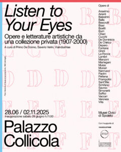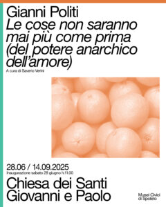 Con questa serie di appuntamenti, Palazzo Collicola continua le celebrazioni del venticinquesimo anno dalla sua apertura: un traguardo che sarà festeggiato per tutto il 2025 con un ricco programma di mostre e iniziative. Anche la Chiesa dei Santi Giovanni e Paolo, una delle sedi Musei Civici di Spoleto, sarà coinvolta nelle inaugurazioni estive con una mostra di Gianni Politi dal titolo Le cose non saranno mai più come prima (del potere anarchico dell’amore) a cura di Saverio Verini.