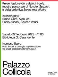 Sabato 22 febbraio alle ore 11.00 a Palazzo Collicola, ci sarà alla Biblioteca G. Carandente, la presentazione dei cataloghi di due delle mostre attualmente in corso nel museo: Spazion, dedicata all’artista umbro Nuvolo e la collettiva Senza mai sfiorire. Densità e leggerezza nella scultura italiana contemporanea.